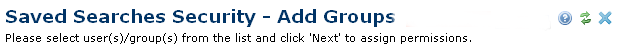 Use this dialog to define which individuals at your site can view your shared search. Click Add Group(s) from the Saved Searches Security dialog.