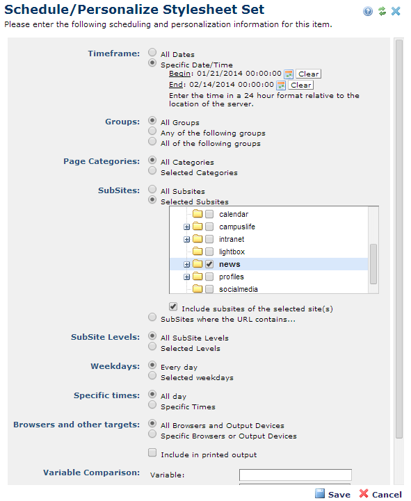 Using the Schedule/Personalize Stylesheet Set dialog, you can define various criteria for using this style sheet, as shown below. CommonSpot examines the scheduling criteria for the set's style sheets in the order defined in Style Sheet Sets. If a set is not available because of the criteria defined in this dialog, CommonSpot looks at the next style sheet set in the list until a match is found. If no style sheets have matching criteria, no style sheet is applied.