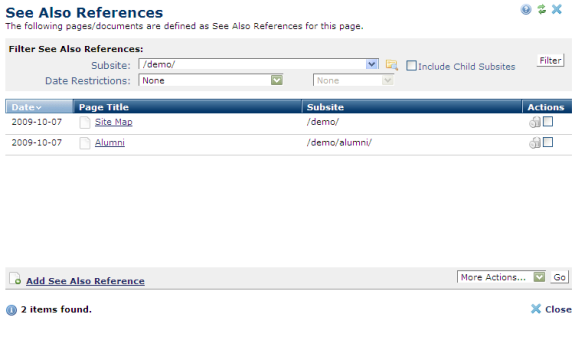 Use CommonSpot See Also References to include links to related Web pages or documents without cluttering your pages with multiple citations or hard-to-maintain links. This feature allows you to centrally review and maintain cross-links to related material contained in your pages.
