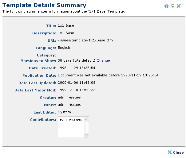 You can review detailed information for any template by opening that template and choosing Properties - Details. This information is also available as a Metadata & Security option in CommonSpot page and template reports. See Report of Pages, Templates, Uploaded Docs & Registered URLs.