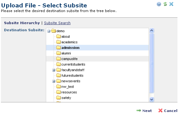 Choose Tools – Upload File to upload allowable file types. First, select the destination subsite for the uploaded document.  Your selection is highlighted, then click Next. The File Upload dialog displays. To enter images into the Image Gallery, use Image Upload.