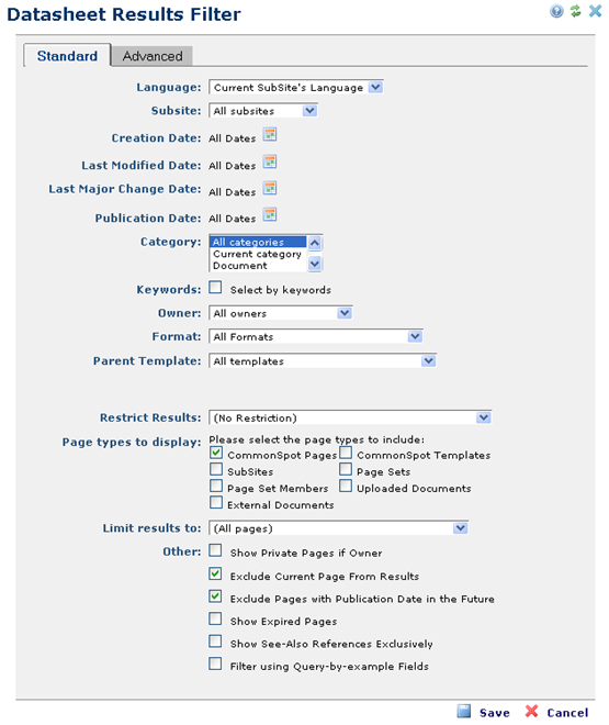 You may also use any of the other filtering options in either the Standard or Advanced tab to further refine which pages are available for display as results of the QBE query.