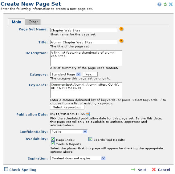 Select a Subsite location and click Next to provide standard information for the Page Set, as shown below. Options in this dialog are defined in the CommonSpot Administrator’s Reference.