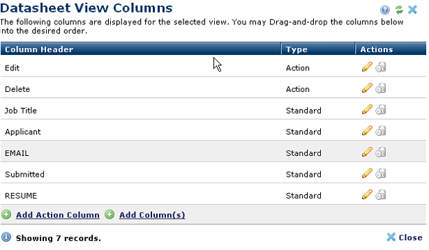 The Datasheet View Columns dialog allows you to control the appearance of each data column for each defined view of a Datasheet Element and allows you to add action columns with hyperlinks to ColdFusion modules that you specify.