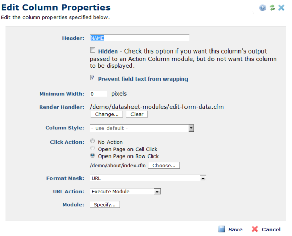 You are here: Elements Reference > Form & Datasheet Elements > Datasheet Element > Edit Column Properties