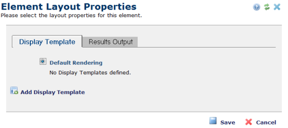 The Element Layout Properties dialog contains options to control the rendering of the Custom Element. The dialog can have two tabs: Display Template and Results Output.