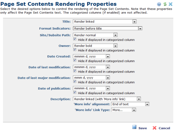 The Page Set Contents Rendering Properties dialog gives you the ability to control how Page Set Content links are presented. Select the Custom via parameters icon from within the Page Set Contents Layout Properties dialog to display this dialog.