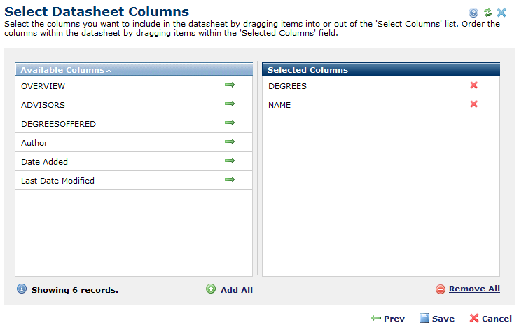 To add a column to the datasheet, select it in the Available Columns list and either click the button or drag it to the right. To remove a column from the datasheet, select it in the Selected Columns list and click the remove button. To add all available columns, click Add All. To remove all columns, click Remove All. To change the order, drag the column’s name to where you would like it to be.