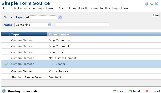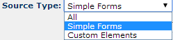 Choosing Select Simple Form/Custom Element in the Create/Select Simple Form dialog displays the Simple Form Source dialog. Use this dialog to choose from existing Simple Forms.