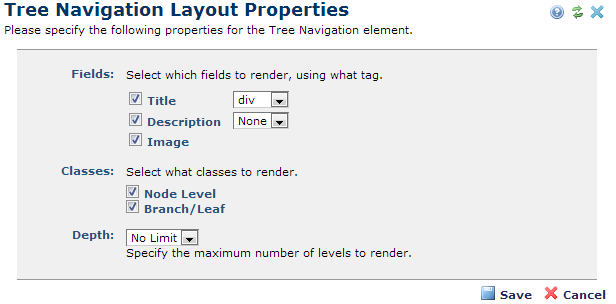 Access this dialog by choosing Layout Properties from the Tree Element menu once a Tree is defined on a page. Layout options control global attributes for the current Tree. Use this dialog to: